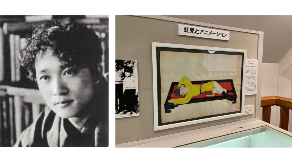 25歳の頃の蕗谷虹児(左)。蕗谷虹児が構成・演出・原画を手掛けた東映初となるカラーアニメーション「夢見童子」の原画(右)。新発田市の蕗谷虹児記念館に展示されています。