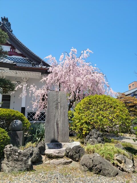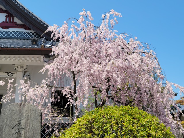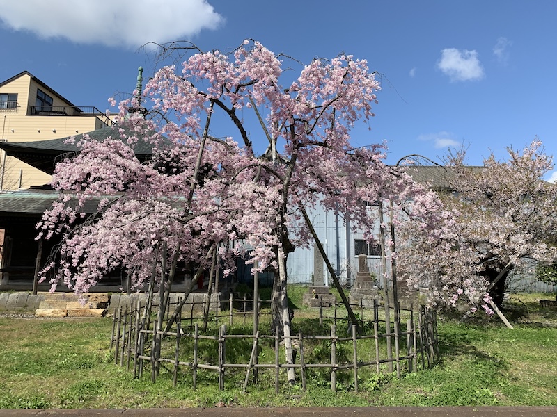 この寺は、近年では「桜の寺」としても多くの市民に親しまれています。境内に咲くシダレザクラとソメイヨシノは、檀家から寄進されたものだとか。