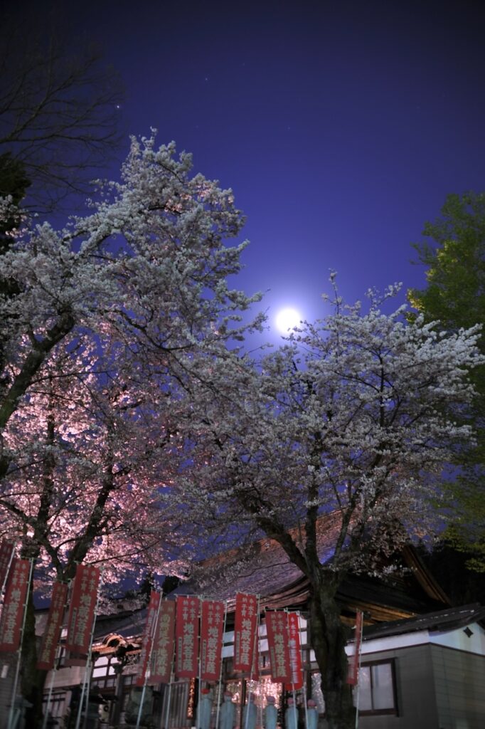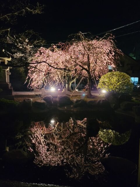 このお寺の桜の最大の魅力は、夜間ライトアップ時に現れる神秘的な姿です。