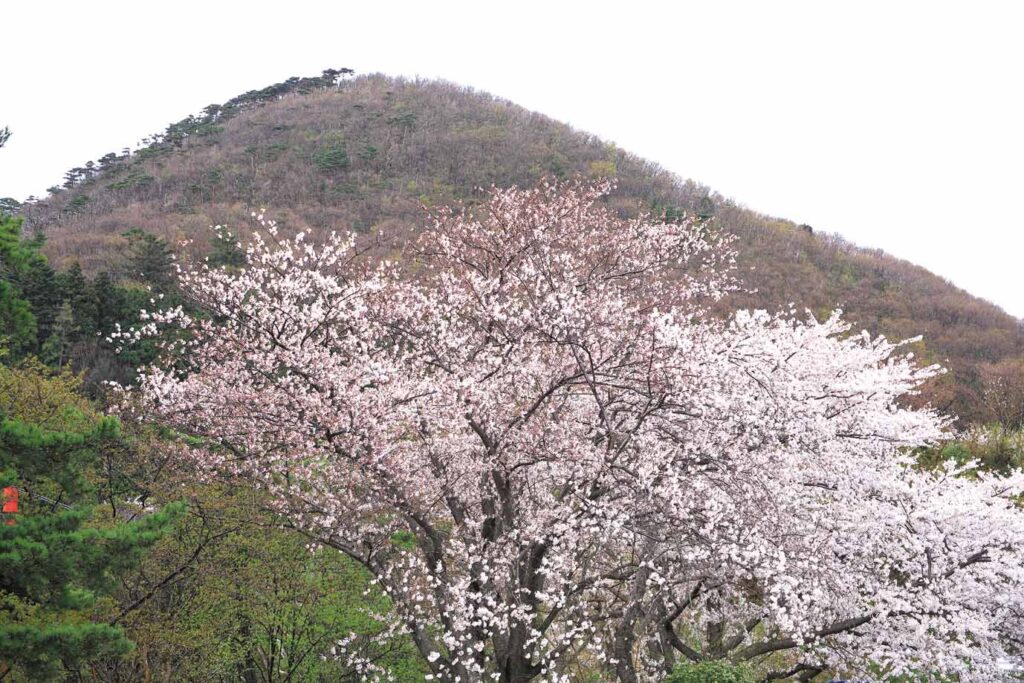 中越地震の際に一部の枝が折れるなどの被害を受けましたが、今なお樹高約20メートルから優美に枝を垂らし、淡い紅色の一重の花を咲かせる姿は、見る者を圧倒します。